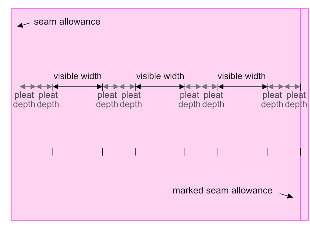 Consider the visible width and depth of the individual pleats before cutting the fabric. By visible width, I mean the part of the knife pleat that is not hidden below the fold. By pleat depth, I mean how deep you fold the fabric (see the schemes below).