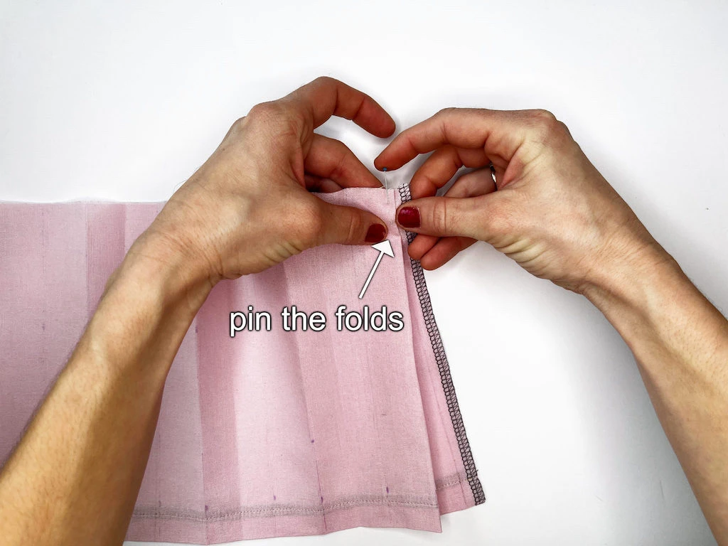 Use pins to keep the folded fabric in place (see the image below). Pin the knife pleats at the top. You can also use multiple pins along the folds to secure the fabric. If you decide to use multiple pins along the folds, make sure they don’t leave big, visible holes in the fabric.